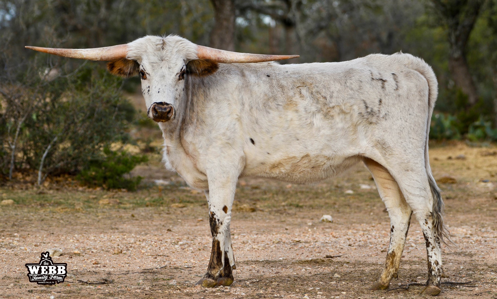 A packed pedigree, twisty horn genetics, roan and brindle bubbling under her white coat, excellent conformation, and a gentle disposition! TTT 37.25 at 13 months, 55"ttt at 21 months!